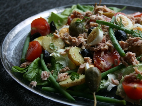 Впервые зарегистрированный в Ницце рецепт включал артишоки, перцы, помидоры, оливки и анчоусы. В наши дни повсеместно мы наблюдаем более сытную его версию – в салат вошли вареные яйца и картофель, стручки фасоли и, конечно, тунец. Кстати, про тунец, консервированный в собственном соку, он вполне приличный. Лучше в оливковом масле, но калорий больше. Свежий – вообще, предел мечтаний, но его еще найти надо. Знаю одного человека, кто назвал консервированный тунец разбухшим в воде картоном: -)) Поражаюсь некоторым ассоциативным рядам… Если вам больше по душе нежность семги, теплой, прямо с гриля, салат от этого только заиграет новыми красками, розовыми, в данном случае. Имеем право на «вольную интерпретацию». Если поставить высокую планку, то куриные яйца заменим на перепелиные. А картофель постараемся найти молодой, с нежной кожицей. Зеленые стручки фасолевые свежие — хороши, но зимой можно использовать и более доступные — замороженные.