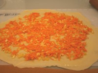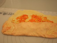 Тесто делим на две равные части. Одну кладем под пленку, с другой начинаем работать. Тесто раскатываем до тончайшего состояния. Кисточкой смазываем растопленным маслом. Раскладываем половину начинки равномерным слоем. Подворачиваем края и закручиваем рулет. Переносим на лист. Опять смазываем поверхность маслом.