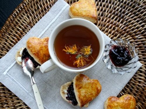 Подаем свеженькие, тепленькие с маскарпоне (или взбитыми сливками, как положено у англичан) и джемом.