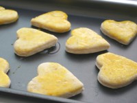 Муку просеиваем со щепоткой соли и пекарским порошком в миску. Добавляем маскарпоне, сахар и масло и разминаем руками до состояния крошек. Затем начинаем постепенно вливать молоко и заводим тесто. Долго вымешивать не нужно. Сразу же раскатываем толстую лепешку (1–1,5 см) и формочкой вырезаем кружки (или сердечки…) Остатки теста собираем и снова раскатываем, вырезаем еще булочки.