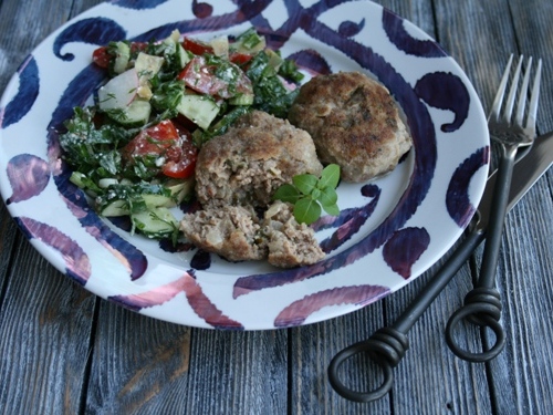 Тщательно смешиваем все компоненты (лучше руками проминаем до однородности). Куриный фарш более влажный (можно использовать меньше сметаны). Формируем небольшие котлеты.