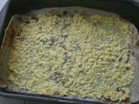 Причем, я заметила, что нижний лаваш лучше сделать несколько больше, чем последующие и его излишки я подвернула под самый верхний слой, как бы закрыв боковые стороны пирога.