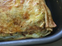 Смазываем форму для выпечки маслом. Кладем первый слой лаваша. Равномерно распределяем тонкий слой начинки (где-то около 3-х столовых ложек). Затем снова лаваш и слой начинки. Так пока всю начинку не уложите. Чем меньше форма, тем больше будет слоев. На мою форму размером около 30х20 см улегло 7 слоев. Верх — слой лаваша. Его смазываем оставшимся четвертым яйцом.