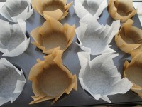 3. Обязательно ли печь с бумажными стаканчиками? По своему опыту знаю, что маффины можно печь с самодельными стаканчиками, которые вырезаются из пекарской бумаги (квадраты 12х12 см) и укладываются в форму (см. фото ниже). Получается стильно. Но можно и без бумажных стаканчиков — смазать углубления маслом.