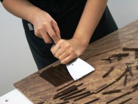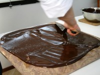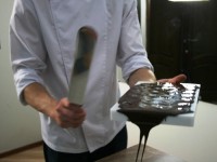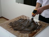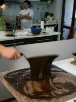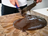 Сначала шоколад растапливают до 45С, потом опускают температуру до 27С, затем снова поднимают до 31–32С. Володя показал нам несколько способов темперирования, а самый старинный из них — на мраморной плите.
