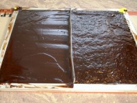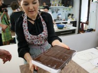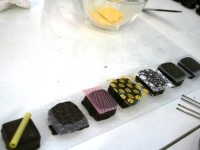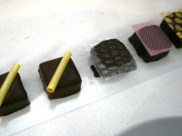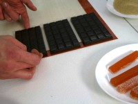 Теперь про глазированные нарезные конфеты — те, которые нарезают и окунают в шоколад. Сначала ганаж (растопленный шоколад со сливками) заливают в рамку и дают ему время, чтобы застыл. Только потом нарезают канцелярским ножом… Наша начинка была двух видов — фисташковая и пряная (кориандр/корица). Непременно посмотрите на способы оформления!