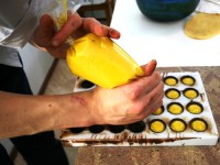 Конвертиком отсаживается начинка для конфет — в данном случае начинка на основе пюре манго.