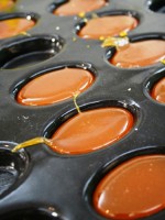 Темперированный шоколад разливается по формам — это заготовка корпусных конфет.