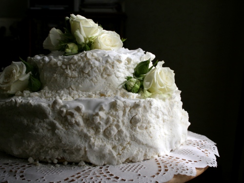 Украшение. Белковая глазурь — увеличьте компоненты в 2 раза, так как нужно покрыть оба торта плотным красивым белоснежным слоем крема.