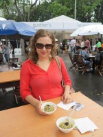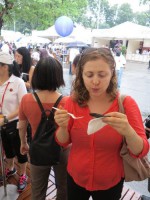 После этой демонстрации мы решили выйти на воздух и посмотреть киоски с дегустациями. Тем более, что дождь закончился и пришло время обеда – отличный повод отведать коронные блюда знаменитых поваров, участвующих в выставке. Первым делом мы отправились к тому самому шефу Alvin Leung и я попробовала молекулярные Xiao Long Bao, а по нашему пельмени.