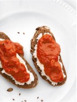 ДЕГУСТАЦИЯ бутербродов с айваром и пинджуром… Свежие кусочки хлеба смазываем тонким слоем творожного сыра, затем кладем пасту из болгарского перца и листики зелени.