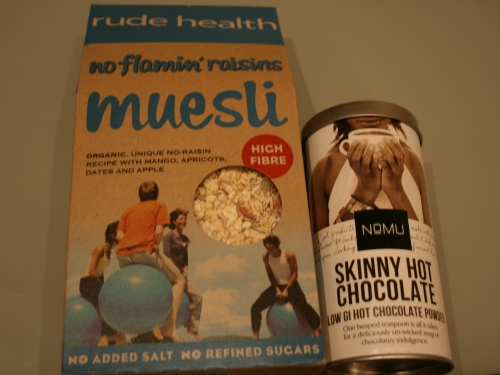 Как я себя побаловала? Купила мюсли без изюма от Rude Health и баночку низкокалорийного растворимого какао (безумно вкусного и кремового).