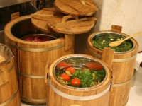 Закуски. Быстрая еда на территории торгового зала. Красивые кадки с соленьями. Салатики, пирожки и прочее — все можно купить и съесть прямо в магазине. Кофе не варят (пока)))), но чай подают.