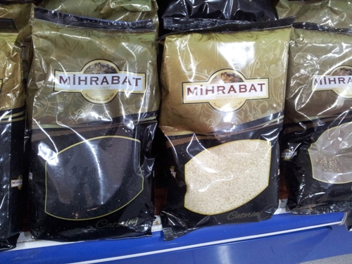 На фото nigella seeds или черный тмин (черненькие семена) — посыпают лепешки… можно использовать в хлебе и салатиках…. страшно незнакомый компонент. Советую почитать о нем в интернете. Прикольная вещь… и кунжут в огромных упаковках.