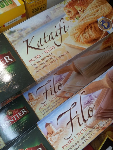 Продолжу разговор о восточных компонентах находкой из «Интерфуда». Тесто фило — нашла простое и шоколадное. Причем шоколадное уже опробовала на двух мастер классах с успехом. Еще тесто КАТАИФИ — оно похоже на тончайшую лапшу. Для пахлавы. А еще им можно оборачивать креветки и жарить во фритюре!)))