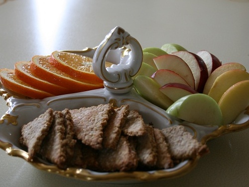 Овсяные хлопья помолоть в блендере почти до состояния муки. В большой миске соединить и перемешать с мукой, пекарским порошком и солью. Сделать углубление в середине, влить масло и кипящую воду. Начать размешивать ложкой, а затем вымесить руками. Разделить на несколько частей. Довольно тонко (3–4 мм) раскатать, порезать на ромбики, выложить на противень и печь 5–10 минут. Причем снизу слайсы подпекаются быстрее, а верх остается довольно бледный. Важно не передержать.