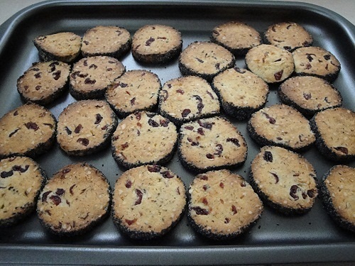 Взбиваем масло с сахарной пудрой до побеления. Затем вводим желтки и сок лимона. Продолжаем взбивать. Наконец, всыпаем муку, молотые орехи и сухие ягоды. Замешиваем тесто, делим на 2 части. Берем два отреза фольги. Каждый присыпаем маком и раскатываем на них 2 небольшие (25–30 см) колбаски. Тесто нужно прижимать так, чтобы семена мака покрыли внешнюю поверхность. Затем плотно заворачиваем фольгой и отправляем в холодильник. Тесто должно охлаждаться не менее 5 часов.