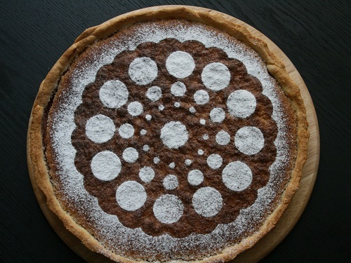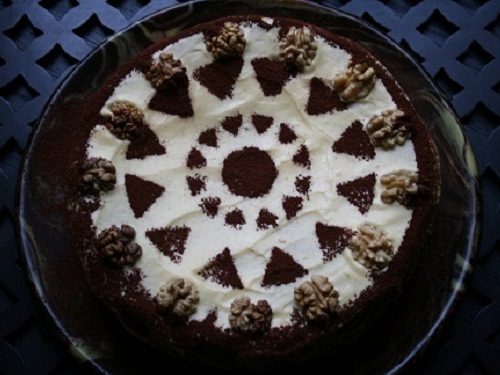 Украшение — какао-посыпка через трафарет. Трафарет вырезаем сами из пекарской бумаги (наподобие вырезки снежинок, как в детском саду). Затем, держим трафарет над уровнем изделия (торта итд) и с помощью ситечка посыпаем какао-порошком. На верхнем фото — ореховый торт с заварным кремом, посыпанный какао-пудрой.