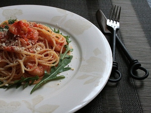 Потушить лук на оливковом масле. Перцы и помидоры измельчить в блендере, добавить к луку с измельченным чесноком и томат-пастой и продолжить тушить на маленьком огне. Как только соус начинает густеть (10–15 минут готовки), присыпаем паприкой (или другими любимыми приправами), солим + перчим. В конце готовки кидаем предварительно размороженные (свежие – это вообще сказка) креветки, держим на огне еще несколько минут. Сервируем с отваренными до степени al dente (чуточку твердые на зубок) спагетти. Подаем с зеленью и пармезаном сразу же.