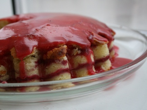Выложить в форму 1/3 количества теста, потом слой малины, затем снова тесто, малину. Завершить последним слоем теста. Выпекать около 50 минут.