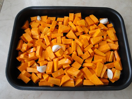 Запекаем тыкву с дольками чеснока, прямо в оболочке, в огнеупорной форме около 20 минут при температуре 200С. После выпечки разминаем в пюре вместе с очищенным чесноком. Затем прямо в тыкву разбиваем яйца, вводим сыр и мускатный орех. Тщательно вымешиваем. Солим и перчим.