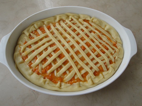 Вернемся к тесту. Нам потребуется форма для выпечки среднего размера (круглая или прямоугольная). Приблизительного размера 40х24см. Её смажем маслом. ¾ объема теста очень тонко (2мм) раскатываем и укладываем в форму, выстилая тестом дно и бортики. Ставим в холодильник на 30 минут. Затем ровным слоем выкладываем начинку. Оставшееся тесто используем для украшения. Раскатываем лепешку, режем её на тонкие жгутики и раскладываем на поверхности.