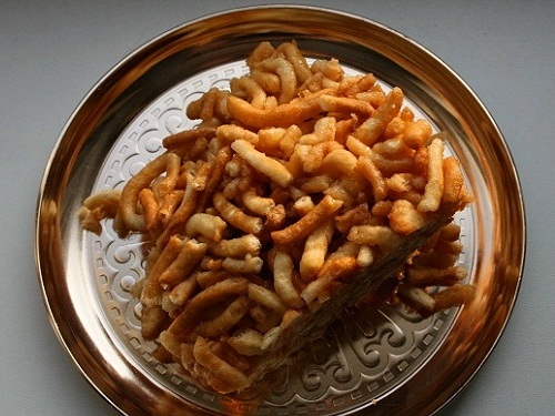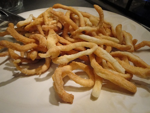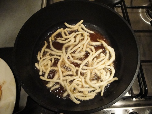 Делим тесто на несколько небольших частей и из каждой раскатываем тонкие лепешки, которые нужно порезать на полоски шириной 0,5–0,3см. Затем эти полоски режем соломкой, как домашнюю лапшу. Распределяем на доске, чтобы не слипались. Обжариваем партиями в кипящем растительном масле до золотистого цвета. В результате получается горка хрустящей соломки. Оставьте её на какое то время в блюде, чтобы стекли излишки масла.