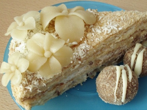 Примечание: Вероника украшала торт белым шоколадом и цветами из марципановой массы. БРАВО! Украшения из марципана лучше делать заранее и хранить в сухом месте — в холодильнике они становятся мягкими и теряют форму.