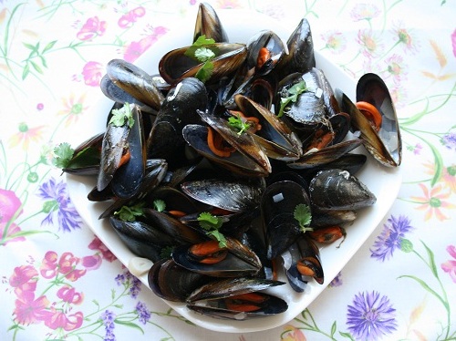 Мидии тщательно моем. В большой кастрюле тушим на оливковом масле порезанный лук с тонкими пластинками чеснока. Добавляем вино, воду (бульон), лавровый лист, солим и перчим. Я, по неопытности, думала, что мидии в своих ракушках, соли даже не почувствуют и в первый раз пересолила. Поэтому количество соли критично. Итак, теперь засыпаем мидии, накрываем крышкой и томим их на небольшом огне минут 10, пока они не откроются под воздействием горячих паров ароматного бульона. Перекладываем в блюдо (из целого килограмма несколько мидий не раскроются — это нормально, они «бракованные»). Посыпаем свежей зеленью и подаем сразу же.