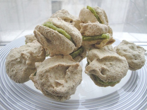 Взбиваем белки с сахаром и добавляем перемолотые орехи. Фисташки перемолоть в блендере или кухонном комбайне в очень мелкую крошку. Причем обязательно с 2 ст. л. сахарной пудры — так орехи не превратятся в кашу в процессе перемола. Белки взбить в крепкую пену, как для обычного безе. Осторожно перемешать с фисташками и выложить на 2 противня, простеленных пекарской бумагой. В этом может помочь кулинарный конверт, или просто выложить небольшие порции чайной ложкой. Всего получится около 30 штук (при маленьких порциях — 40, но они будут быстрее выпекаться). Учесть расстояние между ними. Поставить противни в заранее разогретую до 120С духовку на 2 часа. За это время безе станет сухим и легким.