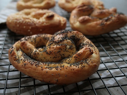 Достаем тесто, тщательно обминаем и делим на 6 равных частей. Из каждой раскатываем длинную колбаску (около 40 см) и укладываем на противень под пленку. В это время готовим кастрюлю с кипящей водой (в воду добавляем соду), шумовку и пекарскую бумагу (по размеру противня), включаем духовку на 200С.