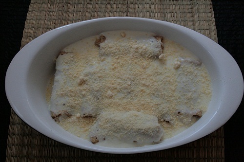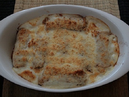 Этот способ мне всегда помогает избегать появления комочков. Смешиваем молоко и муку в небольшом сотейнике. Ставим на маленький огонь. Добавляем кусочек масла и начинаем вымешивать. Соус должен загустеть до консистенции кефира. Солим, перчим, бросаем щепотку молотого мускатного ореха прямо перед тем как снять с огня. Заливаем блины, посыпаем сыром и отправляем в разогретую духовку.
