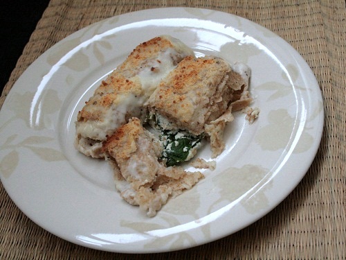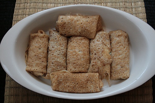 Для начинки смешать все компоненты, посолить и поперчить. Каждый блин начинить, аккуратно свернуть и уложить в жаростойкую форму.