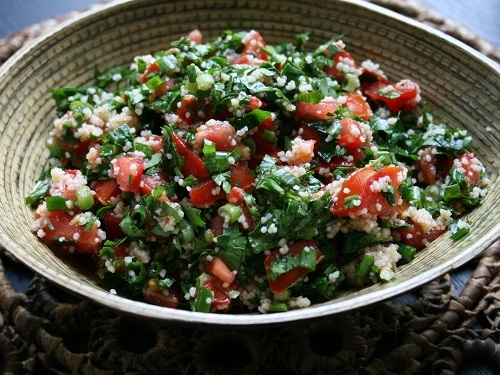 Петрушку и мяту тщательно промыть, положить на кухонное полотенце, чтобы лучше просушить. Очистить зелень от жестких стебельков, очень мелко порезать хорошим острым ножом (но ни при каких обстоятельсвах не использовать для этого блендер). Также мелко порезать лук, а помидоры просто на маленькие кусочки, уложить в чашку, добавить кус-кус. Кстати, так как кус-кус у нас в дефиците, то можно взять 1/2 чашки отварного риса (в некоторых источниках я встречала и такую версию табули, а в оригинале используется БУЛГУР (бургуль), это тоже из разряда пшеничных круп)