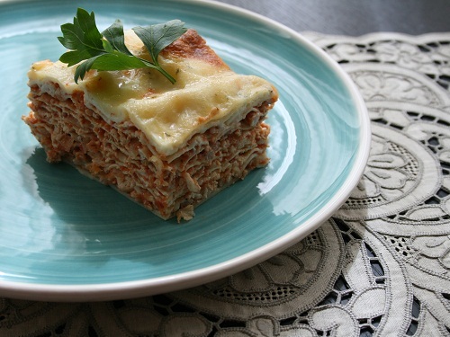 Наконец, накрываем блюдо пленкой и даем так постоять несколько часов, чтобы слои теста «напитались». Затем ставим в духовку, разогретую до 180С на 30 минут до появления золотистой корочки.