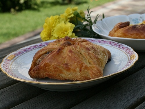 Как только тесто понадобится – вынуть из холодильника, довести до комнатной температуры и раскатать на рабочей поверхности в прямоугольник, свернуть как лист А4, вкладываемый в конверт. Уложить швом вниз и повторить еще 3 раза. Весь объем теста лучше разделить на 2 части. Одну можно заморозить. Другую использовать — раскатать, разделать (для 1 целого пирога или на индивидуальные небольшие изделия, 12 штук) и оставить на 1,5 часа в тепле, чтобы тесто поднялось. Перед выпечкой смазать желтком. Печь около 25–30 минут при температуре 180С.