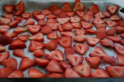 Ягоды тщательно моем, обсушиваем на кухонном бумажном полотенце. Затем тонко (около 2 мм) режем вдоль или поперек и укладываем на противень, простеленный пекарской бумагой.