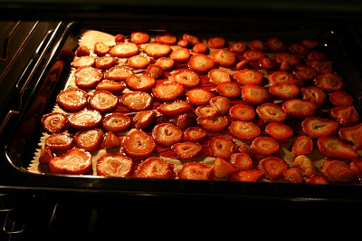 Ставим в духовку, разогретую до 100С. Всего клубника там должна простоять 3 или 3,5 часа. Но после второго часа ягоды будем переворачивать.