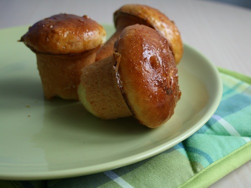 Дать булочкам еще раз подойти. Не забудьте накрыть их, чтобы не подсохли. Перед выпечкой смазываем яйцом и отправляем в духовку, разогретую до 200С на 20 минут — до момента, пока они не станут золотистыми. Достаем из духовки, оставляем в форме на несколько минут и выкладываем на тарелку.