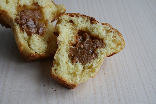 Делим тесто на 12 частей. Из каждой формируем небольшую лепешечку, кладем чайную ложку (или чуть больше) вареной сгущенки, хорошо заворачиваем края, чтобы начинка оказалась в середине и не вытекла при выпечке. Теперь укладываем в форму и так все 12 штук. У нас ушло около 3/4 банки вареной сгущенки.