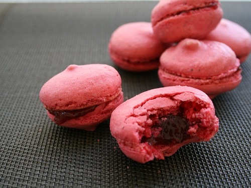 Я пекла розовые макаруны и склеивала их малиновым джемом (обычным, из магазина). Пол чайной ложки на штуку. Результат на фото.