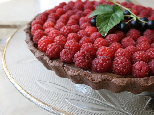 Готовую остывшую тарталетку вынимаем из формы и перекладываем в блюдо. Выливаем в середину крем и разравниваем его поверхность. Теперь накрываем пищевой пленкой, чтобы весь крем ПОЛНОСТЬЮ соприкасался с пленкой и отправляем в холодильник.