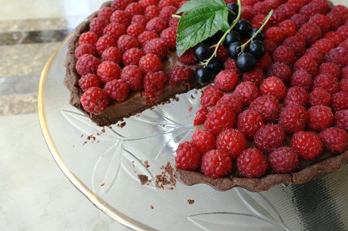 На следующий день снимаем пленку и украшаем верх торта свежей малиной (300 — 400 г отборных ягод). Подаем!
