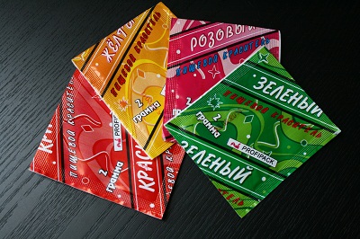 Честно говоря, если можно «радужного разнообразия» в готовке избежать, то так и поступайте. Я ратую за все натуральное. Поэтому, крайне редко сама применяю данный продукт. Пищевые красители бывают жидкими и пастообразными. У нас для «широкой аудитории» имеются сухие (порошковые) — красный, желтый, розовый и зеленый. Марка «Profipack» (производитель приправ, специй и различных кулинарных добавок), 2 г в упаковке.