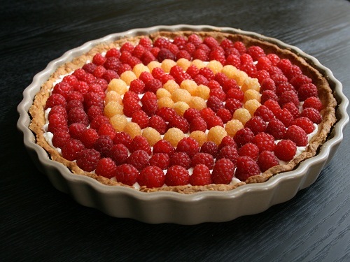 Скажу сразу, что этот вид песочного теста, пожалуй, самый хрупкий и нежный (за счет кокосовой стружки), поэтому готовую тарталетку я оставила в керамической форме (около 27 см в диаметре), в которой пекла. В ней наполнила кремом, украсила и, в конце концов, сервировала. В подобной форме можно резать и не бояться повредить поверхность.