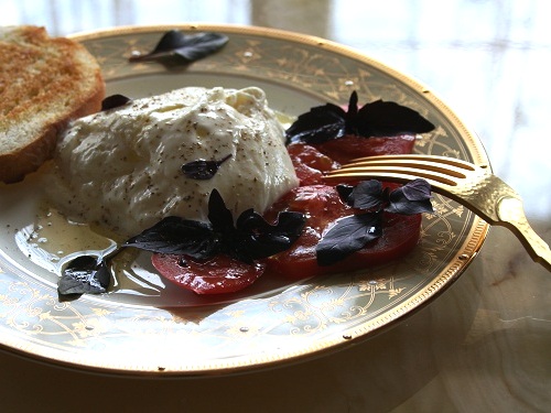 Истинные итальянцы говорят, что буррата хороша сама по себе, в чистом первозданном виде, но самый удачный вариант сервировки данного сыра, признанный гурманами во всем мире — с ломтиком хлеба, помидорами, базиликом, оливковым маслом.