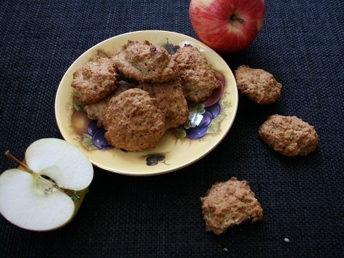 С помощью миксера взбить масло с сахаром, затем ввести яйцо. Отдельно смешать муку с солью, корицей, хлопьями и содой. В несколько этапов соединить с масляной массой. Наконец, ввести яблочную составляющую. Вымешать ложкой. Тесто получится густое, тягучее. С помощью чайной или столовой ложки выложить на противень, учитывая расстояние между печенюшками, и отправить в духовку. Печь 15–20 минут до золотистого оттенка.