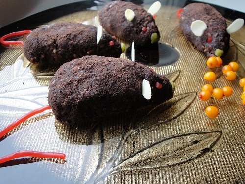 Печенье и вафли перемелем в крошку в кухонном комбайне или в блендере. Затем также помелем орехи. Соединим все в миске с горячим молоком, в котором предварительно растворим какао. Нужно добиться консистенции массы, которая очень пластична. Слепим мышей, вывалив их в какао-порошке. Затем присоединяем уши-носы-хвосты. Всего получается 12 мышей длиной 5–6 см.