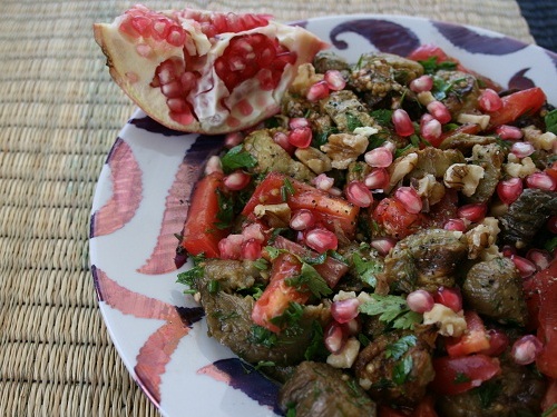Баклажаны моем, снимаем с них кожицу, режем на кружки около 1 -1,5 см толщиной, укладываем на противень, сбрызгиваем 2 ст. л. оливкового масла. Печем в хорошо разогретой до 200С духовке около 30 минут (следите за баклажанами — они должны стать мягкими, но не разваливаться). Остывшие баклажаны смешиваем с нарезанными на кубики помидорами, поливаем заправкой из оливкового масла, уксуса и раздавленного чеснока. Солим и перчим. Сверху посыпаем зеленью кинзы, грецкими орехами и гранатом.