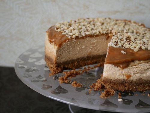 Перед подачей чизкейк нужно украсить оставшейся вареной сгущенкой и молотым фундуком.